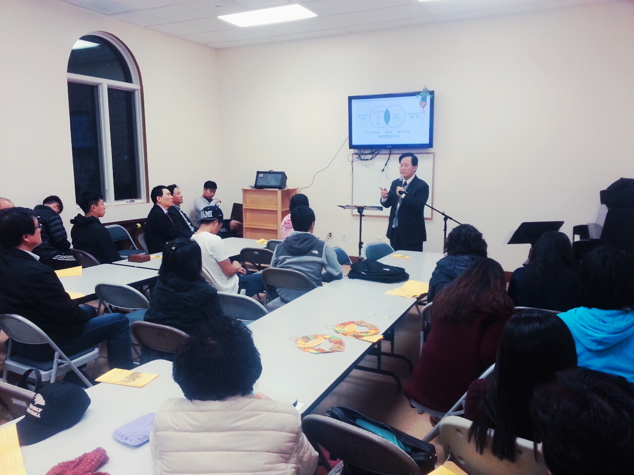 매주 화요일마다 한소망교회에서 주최되던 화요모임이 11월 4일부터 뉴저지연합교회에서로 장소가 변경되었습니다. 사랑의 집에서 가까웠던 한소망교회에 벌써 익숙해져 있었던 터라 새로운 장소가 낯설었지만 무사히 마칠 수 있었습니다. 뉴저지연합교회에서 만나는 첫 날에다 모이는 시간까지 변경되어서 경황이 없음에도 불구하고 세계관에 관한 특별 강의 2부를 수월하게 진행해 주신 백도영 선교사님께 정말 감사드립니다. 다음 주부터 계속 뉴저지연합교회에서 모일 예정인데요, 앞으로 첫 날 있었던 문제점을 하나씩 보완해 나갈 수 있었으면 좋겠습니다.