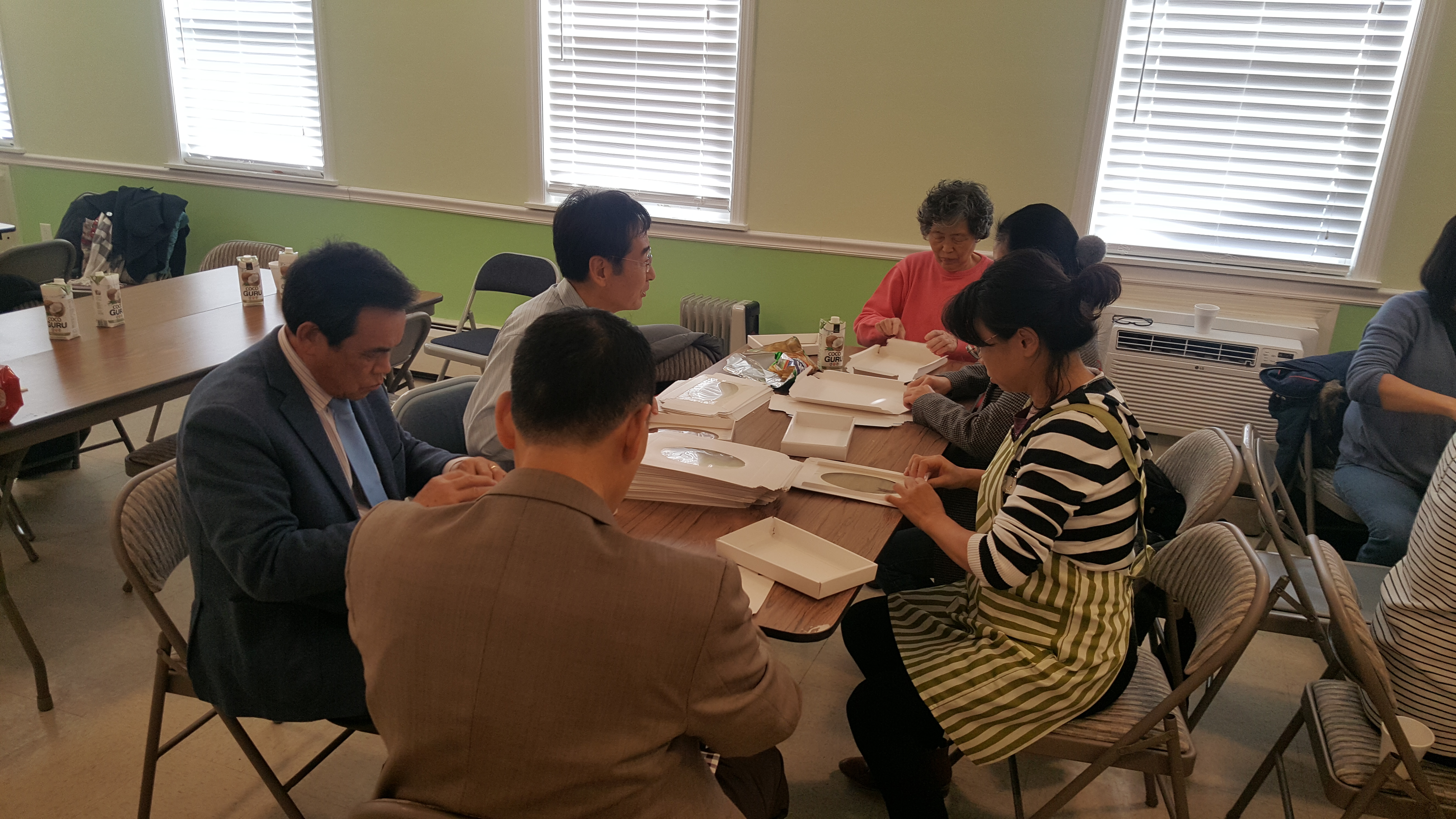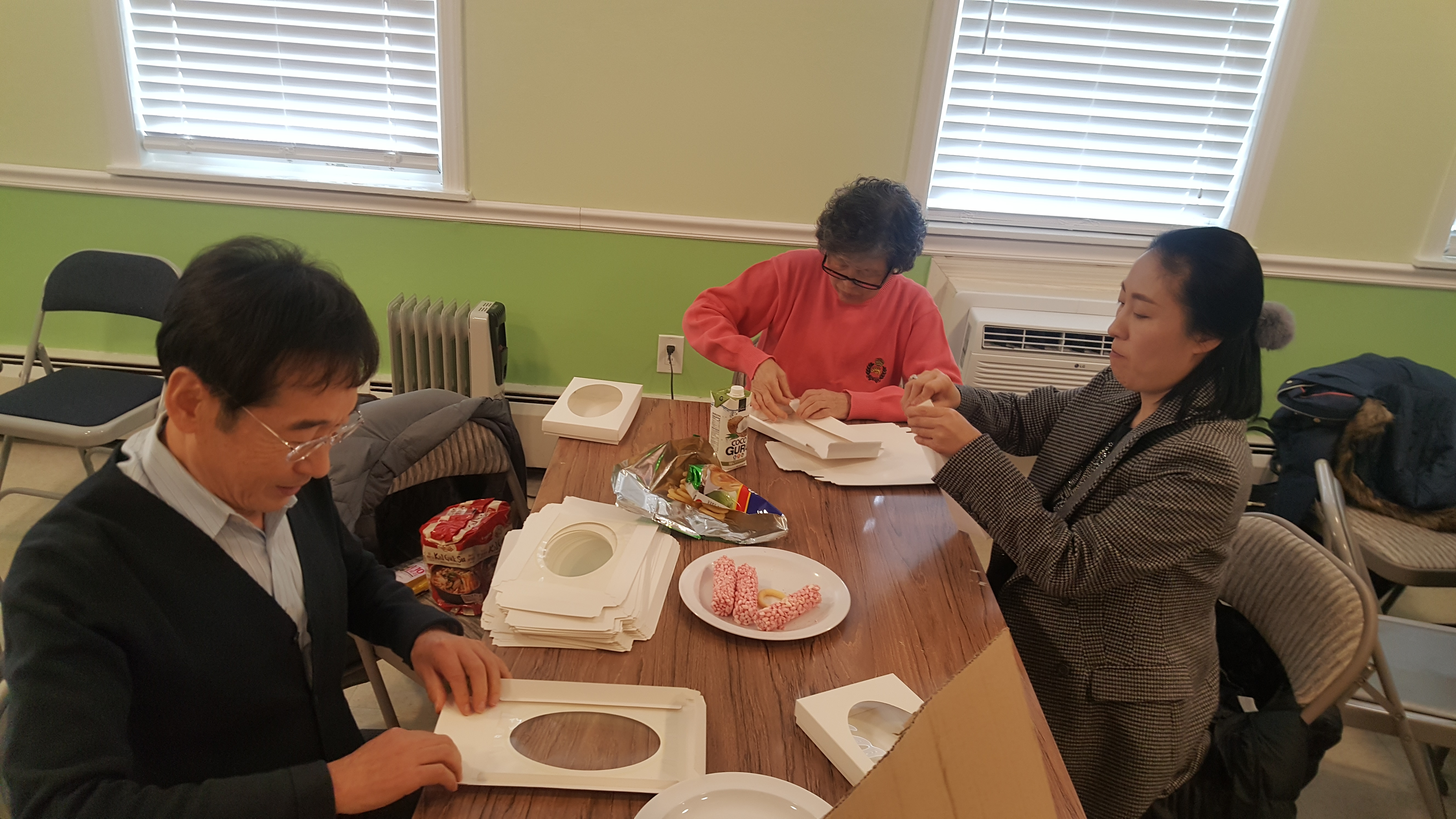 밀알 가족들이 방향제 박스 접기로 나눔을 합니다.